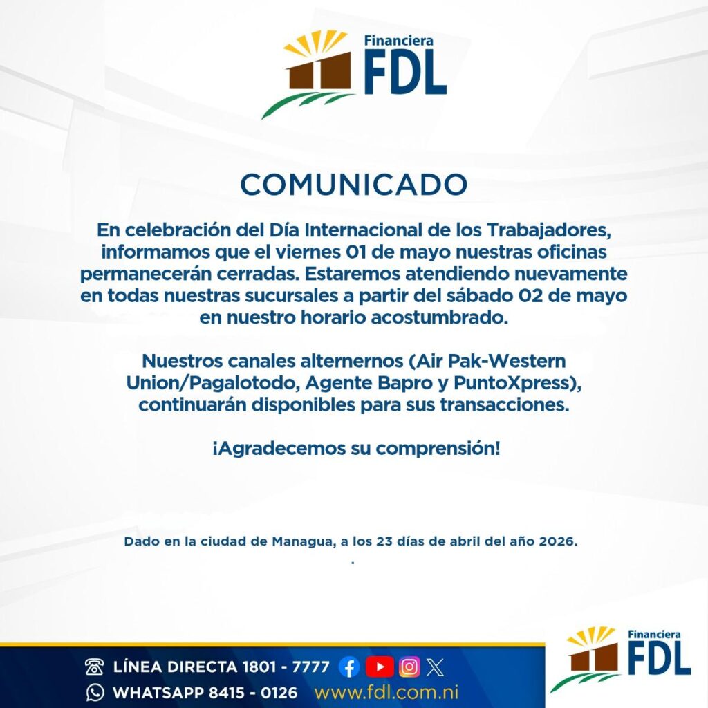 Financiera FDL inicia operaciones el tres de mayo del 2016, después de cumplir los requerimientos y ser autorizada por la Superintendencia de Bancos y de Otras Instituciones Financieras, SIBOIF.