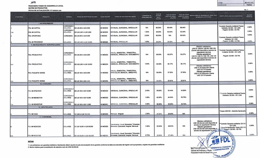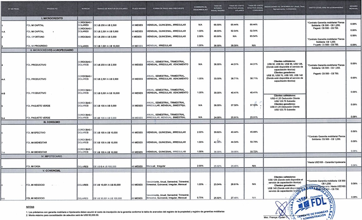 Financiera FDL tiene créditos desde US$ 100 hasta US$ 100 mil dólares, en moneda nacional o dólares norte americanos, con plazos máximos hasta de 60 meses para aprovechar las ventas de temporada, compra de viviendas, entre otros productos. La frecuencia de pago varía según la actividad económica de los clientes: quincenal, mensual, irregular, trimestral, semestral, anual y al vencimiento.